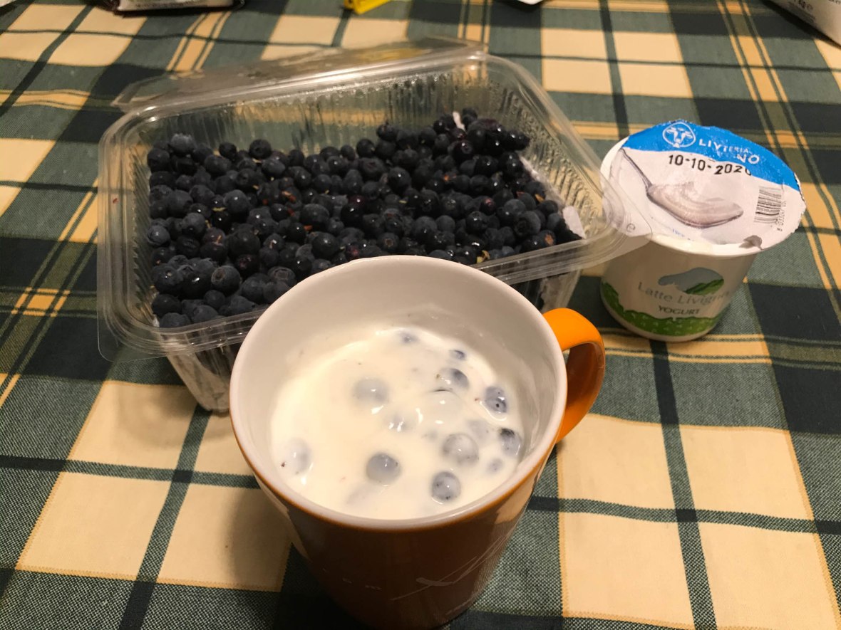 La raccolta di mirtilli della giornata di ieri da i suoi primi risultati proprio questa mattina: Tomma infatti al risveglio decide di scaricare un bidone di prelibate bacche in un vasetto di yogurt, assicurandosi una permanenza giornaliera in cesso di qualche ora.